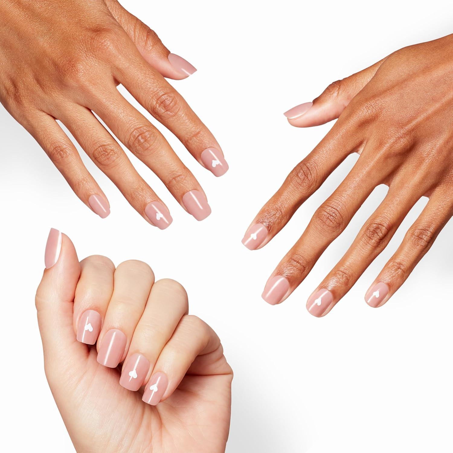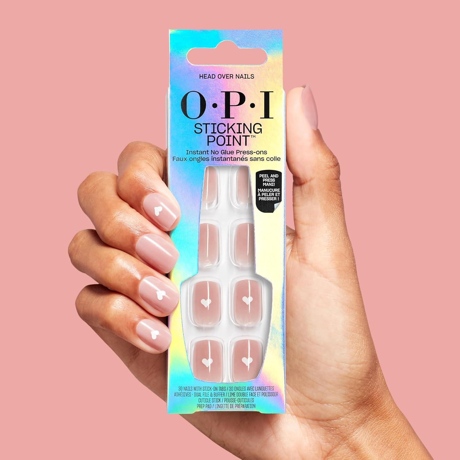 OPI Sticking Point | Instant No Glue Press On Nails | 30 Count with Adhesive Tabs | Short Round, Almond and Squoval | Damage-Free Wear | Spring 2026(Head Over Nails | Opaque Warm Neutral with White Hearts)