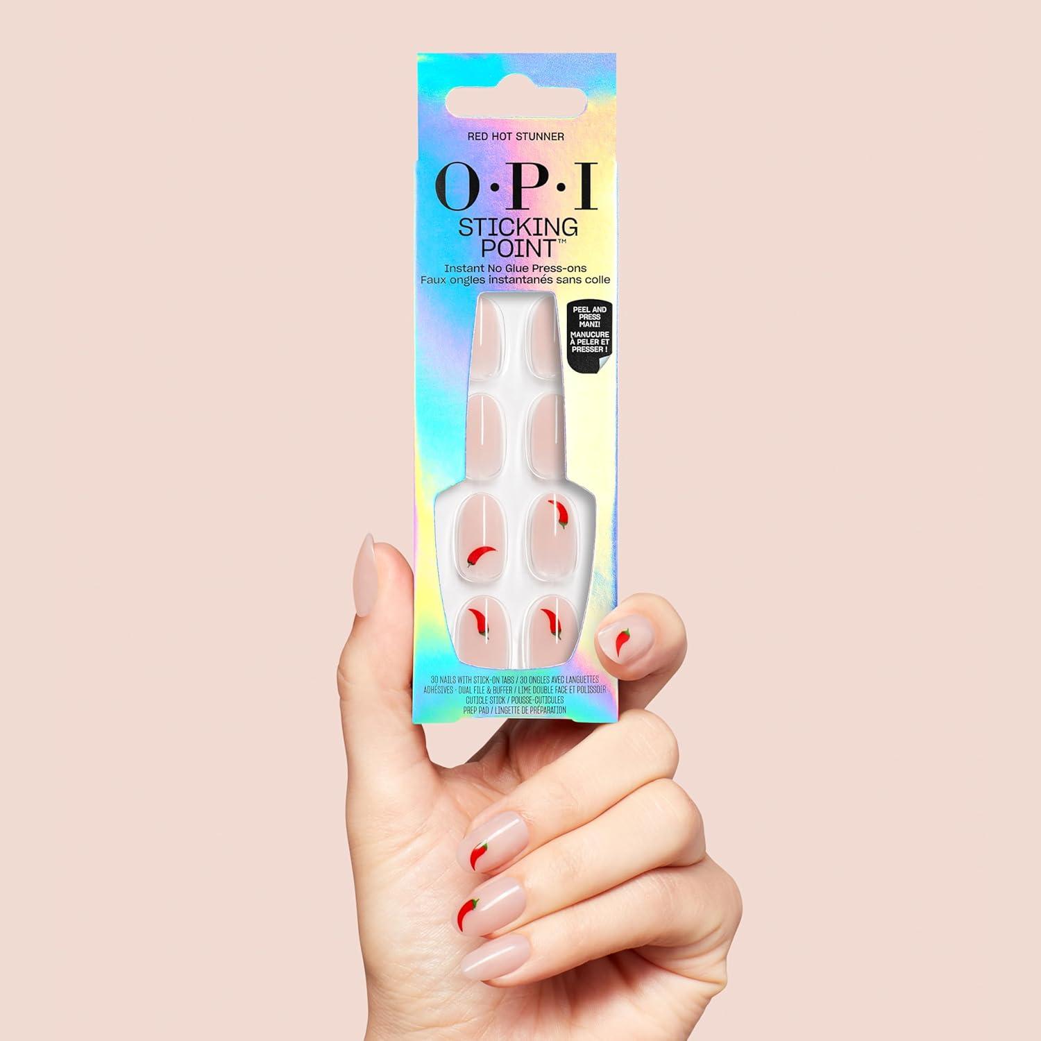 OPI Sticking Point Red Hot Stunner | Short Round Opaque Warm Neutral with Chili Pepper Nail Art Instant No Glue Press On Nails | 30 Count with Adhesive Tabs | Damage-Free Wear | Spring 2026